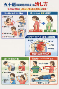 五十肩は“自然に治る”と言われることもありますが、治りが遅い・長引く・途中で悪化するケースも少なくありません。この記事では、鍼灸以外の視点で、整体・運動療法中心の「治し方」をわかりやすくまとめます。特に、見落とされがちな治らない理由と、回復に欠かせないインナーマッスル強化について深掘りします。