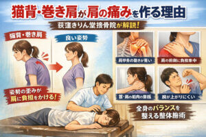 今回は、なぜ猫背や巻き肩が肩の痛みを作ってしまうのか、そして荻窪きりん堂接骨院では整体でどのようにみていくのかをわかりやすくお伝えします。